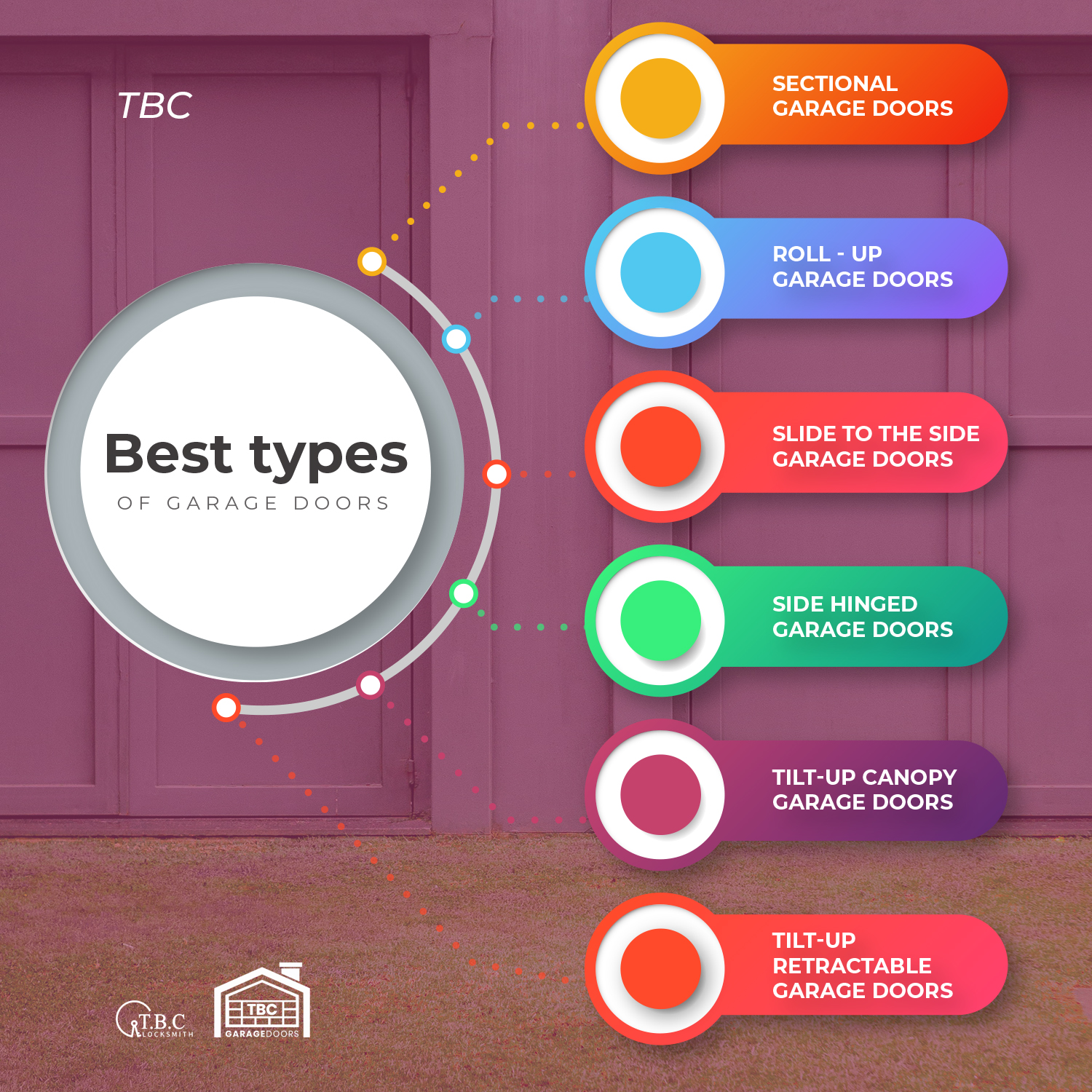 There are numerous types of garage doors to choose from. Though the six most common types are sectional, roll-up, slide, side hinged, tilt-up canopy and tilt-up retractable. It is important to also decide on the material, the finish and other fittings such as insulation, window and hardware for your garage door purchase or replacement.